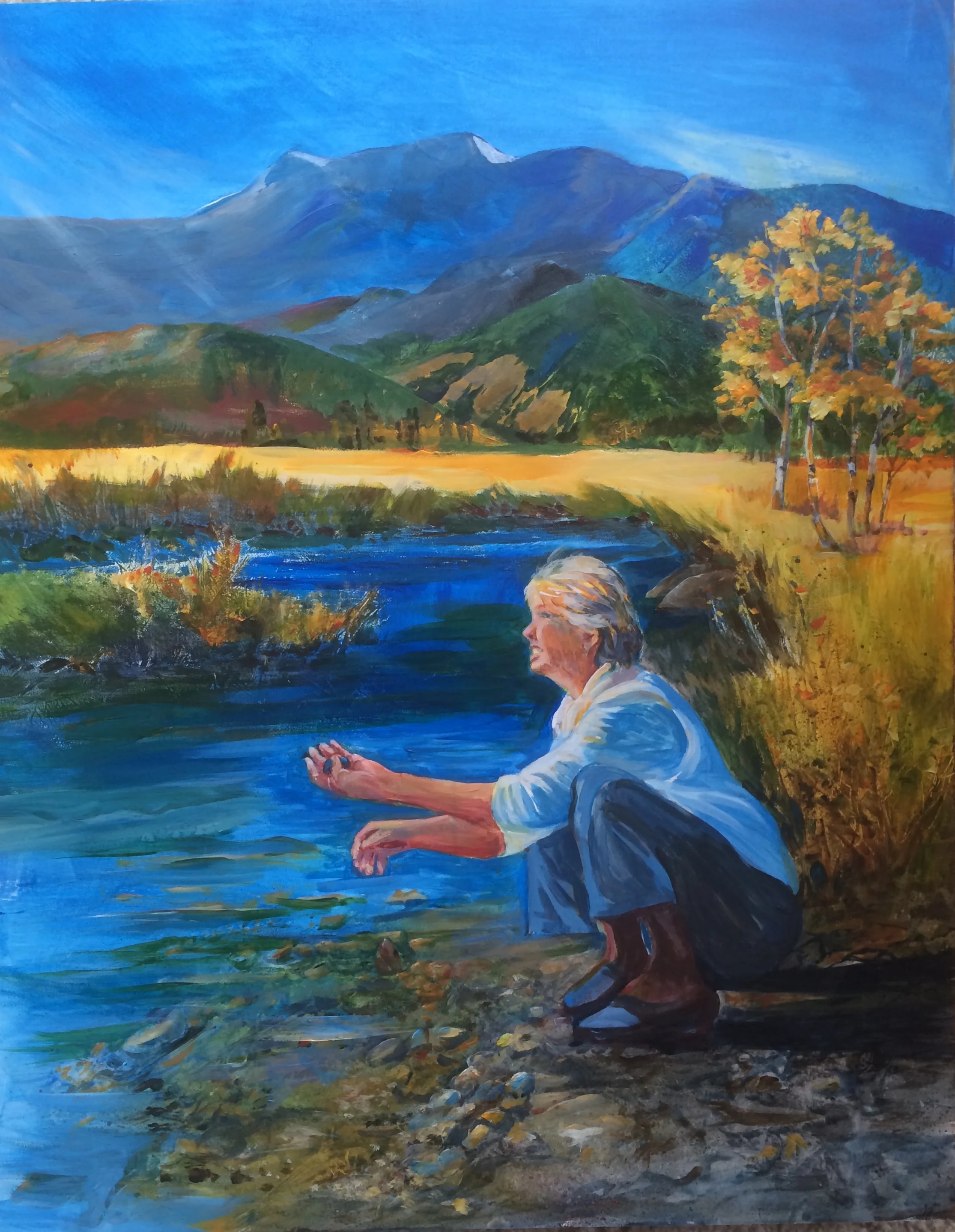 Many of my recent paintings celebrate life in Colorado, a state of natural grandeur graced by intense blue skies and dramatic mountainscapes, all covering dry upland desert. I lived there and chose to paint in vibrantly colored acrylics.